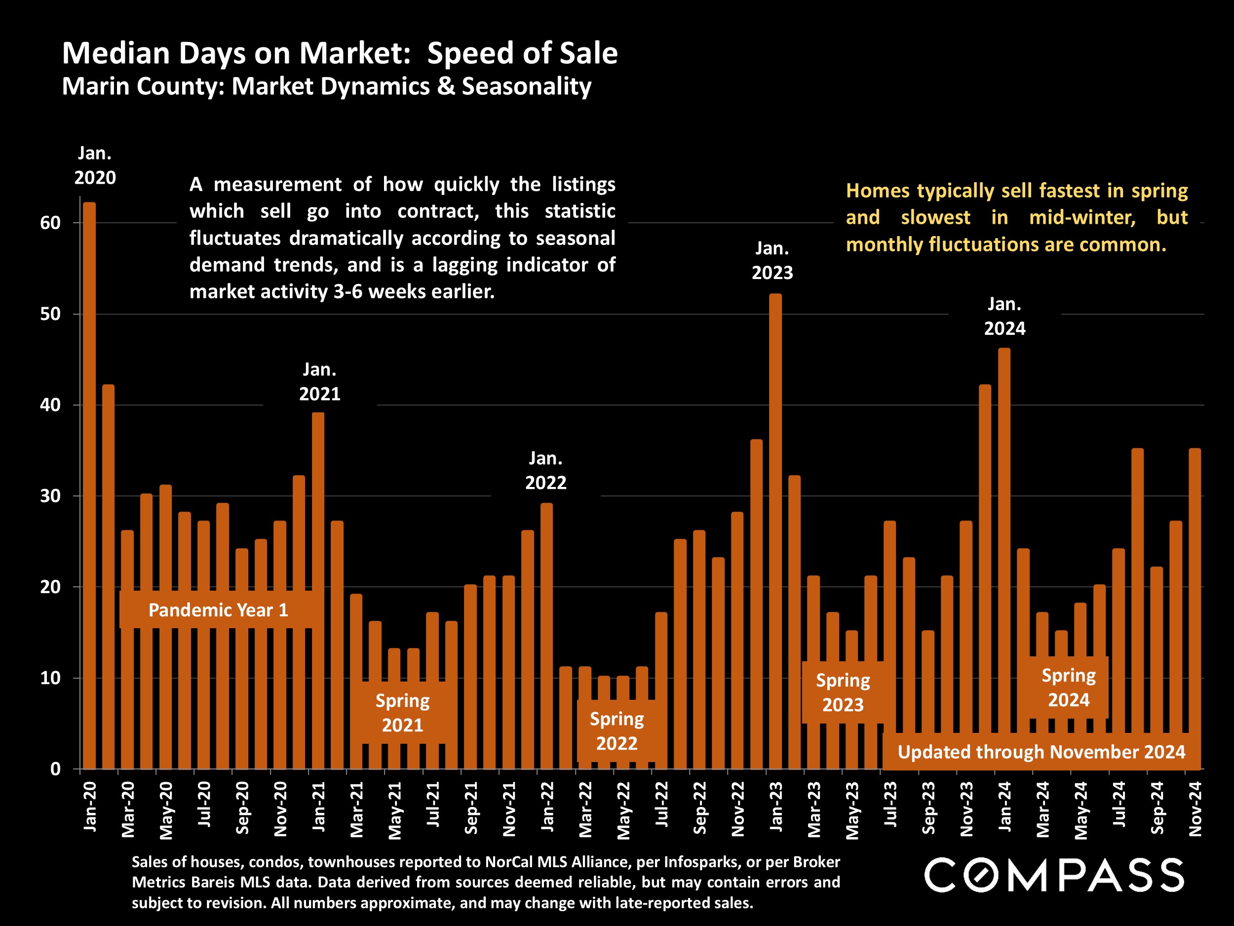 Statistics are generalities, essentially summaries of widely disparate data generated by dozens, hundreds or thousands of unique, individual sales occurring within different time periods. They are best seen not as precise measurements, but as broad, comparative indicators, with reasonable margins of error. Anomalous fluctuations in statistics are not uncommon, especially in smaller, expensive market segments. Last period data should be considered estimates that may change with late-reported data. Different analytics programs sometimes define statistics - such as "active listings," "days on market," and "months supply of inventory" - differently: what is most meaningful are not specific calculations but the trends they illustrate. Most listing and sales data derives from the local or regional multi-listing service (MLS) of the area specified in the analysis, but not all listings or sales are reported to MLS and these won't be reflected in the data. "Homes" signifies real-property, single-household housing units: houses, condos, co-ops, townhouses, duets and TICs (but not mobile homes), as applicable to each market. City/town names refer specifically to the named cities and towns, or their MLS areas, unless otherwise delineated. Multicounty metro areas will be specified as such. Data from sources deemed reliable, but may contain errors and subject to revision. All numbers to be considered approximate.