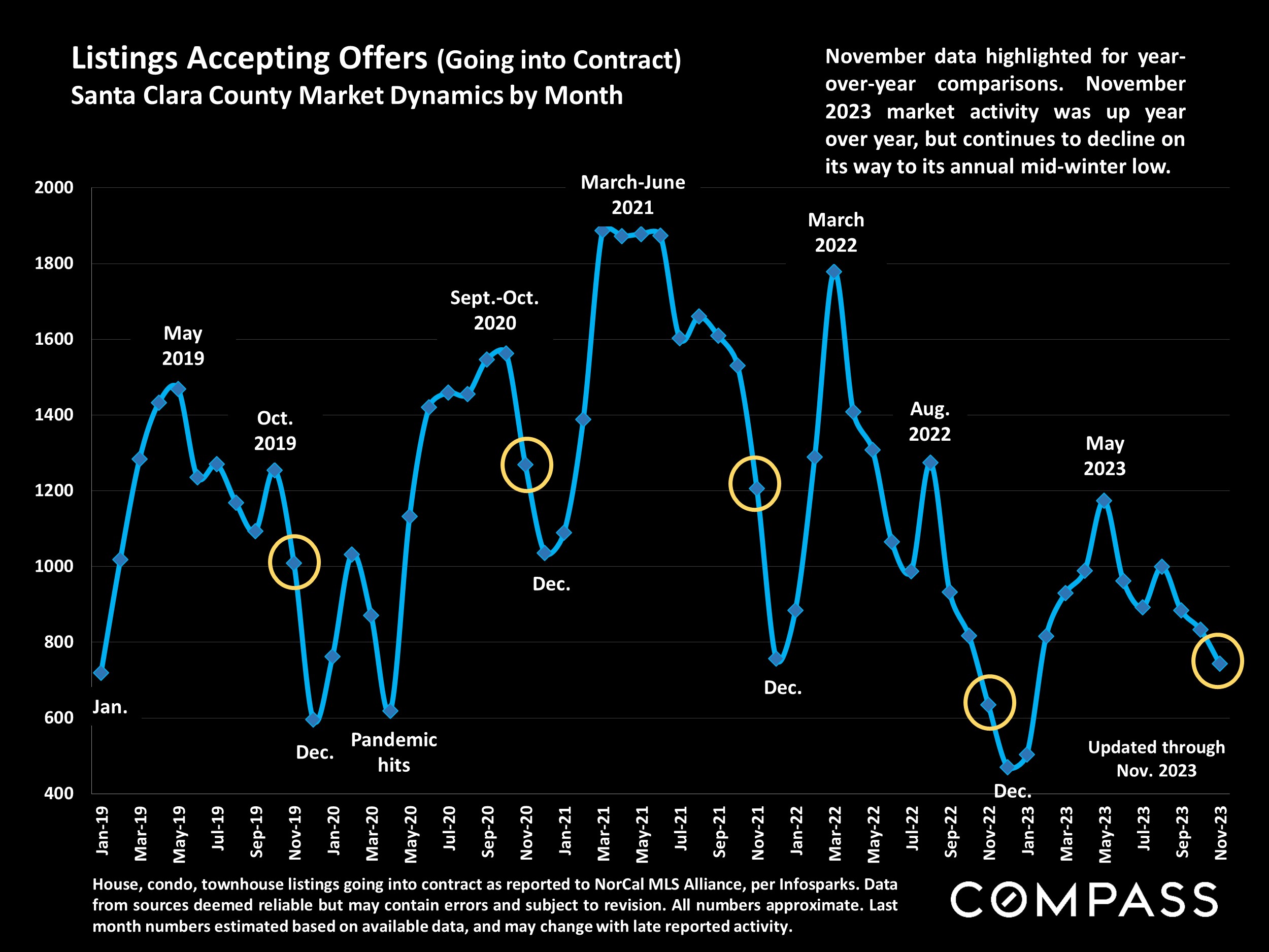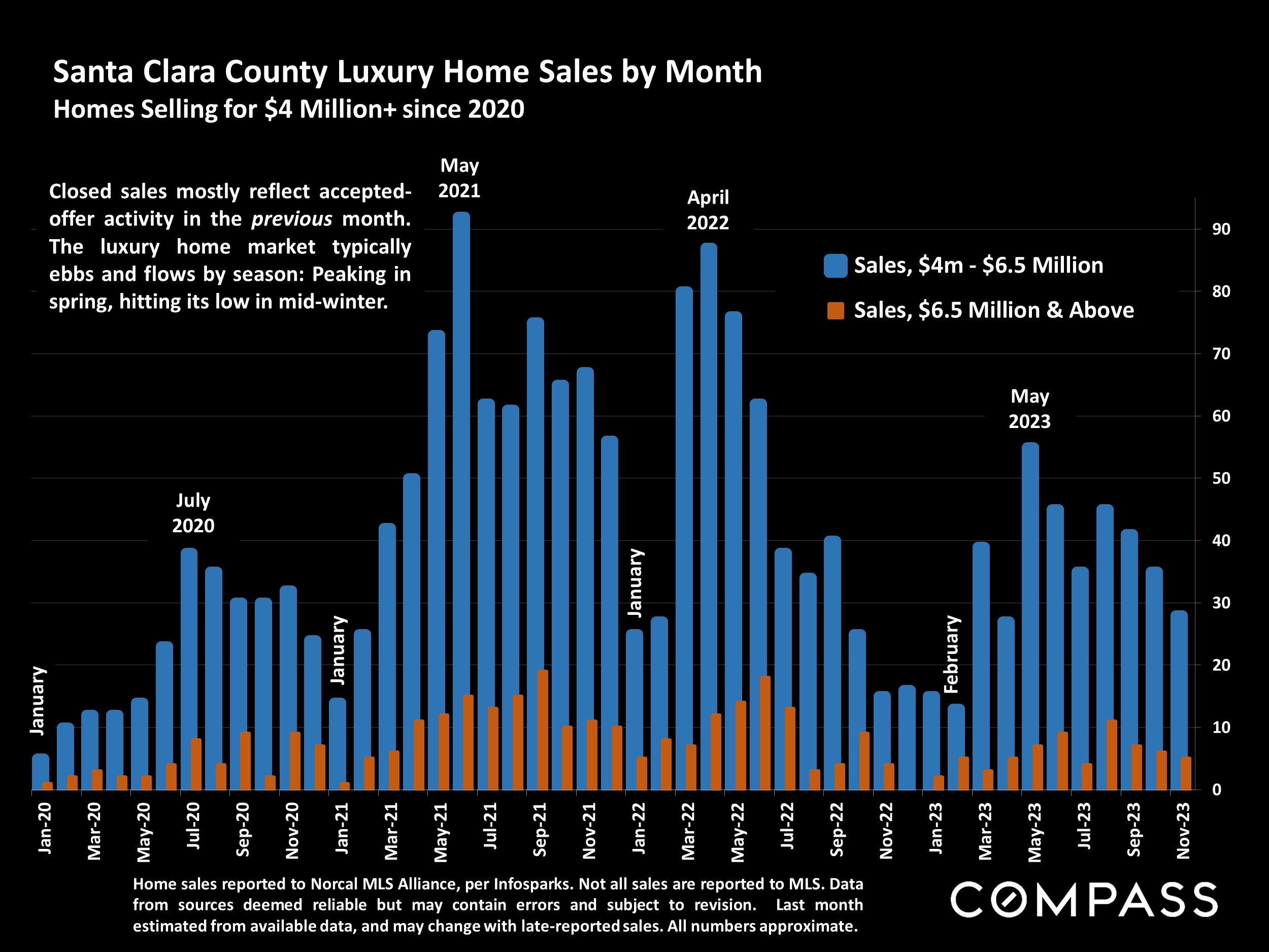 Statistics are generalities, essentially summaries of widely disparate data generated by dozens, hundreds or thousands of unique, individual sales occurring within different time periods. They are best seen not as precise measurements, but as broad, comparative indicators, with reasonable margins of error. Anomalous fluctuations in statistics are not uncommon, especially in smaller, expensive market segments. Last period data should be considered estimates that may change with late-reported data. Different analytics programs sometimes define statistics - such as "active listings," "days on market," and "months supply of inventory" - differently: what is most meaningful are not specific calculations but the trends they illustrate. Most listing and sales data derives from the local or regional multi-listing service (MLS) of the area specified in the analysis, but not all listings or sales are reported to MLS and these won't be reflected in the data. "Homes" signifies real-property, single-household housing units: houses, condos, co-ops, townhouses, duets and TICs (but not mobile homes), as applicable to each market. City/town names refer specifically to the named cities and towns, or their MLS areas, unless otherwise delineated. Multicounty metro areas will be specified as such. Data from sources deemed reliable, but may contain errors and subject to revision. All numbers to be considered approximate.